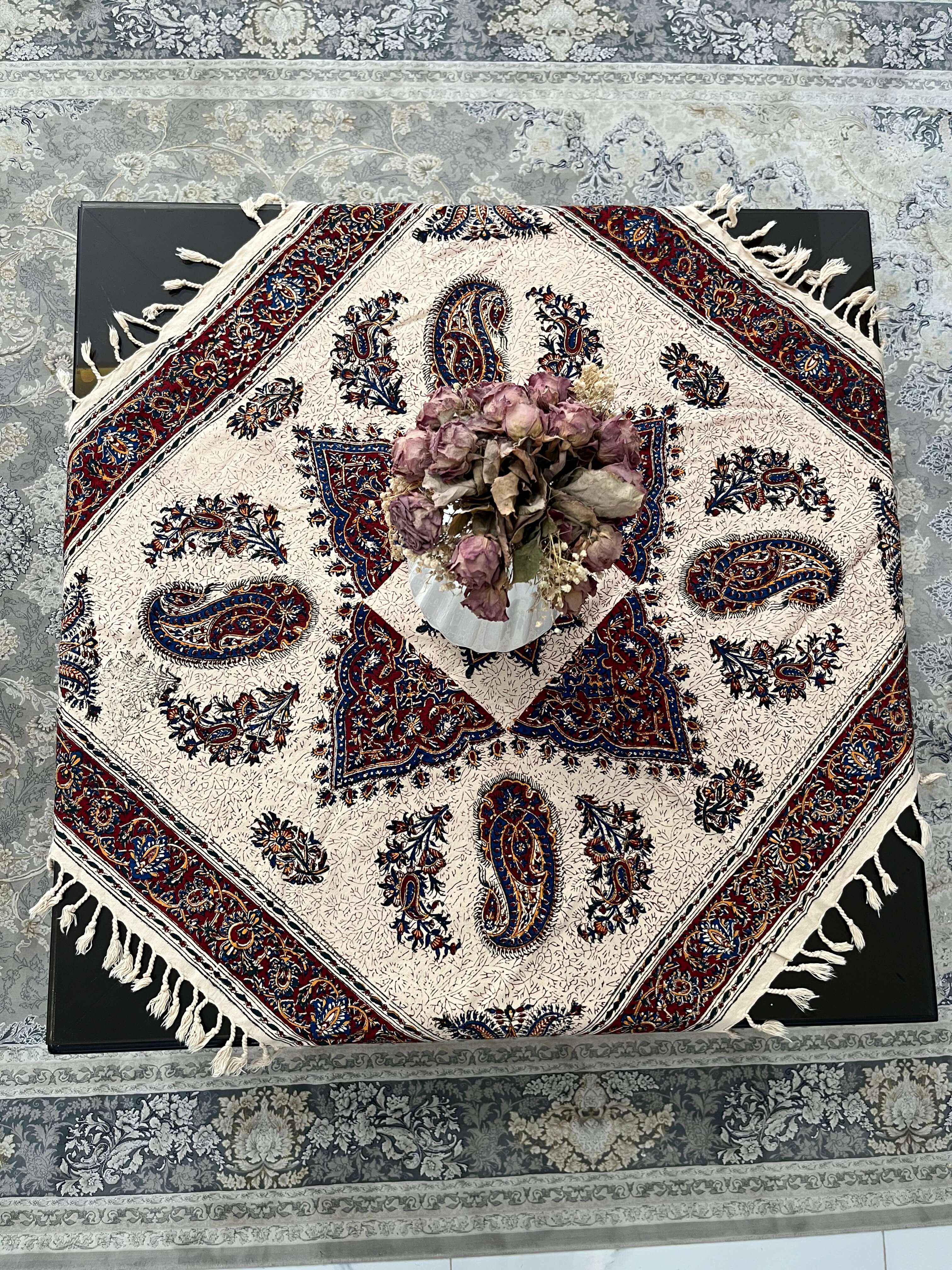 رومیزی مربع قلمکار اصفهان 100*100 کرم قرمز مدل 6