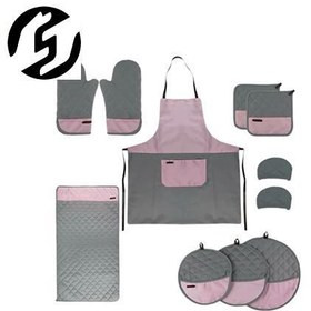دمکنی 3تکه، 1 جفت دستگیره، 1 جفت دستکش فر، ظرف خشک کن، پیشبند، 1 جفت چدن گیر